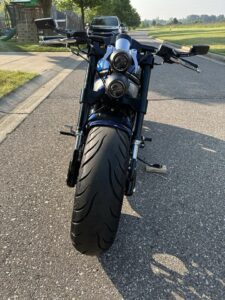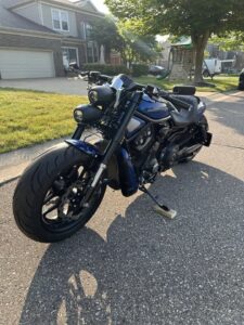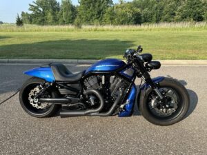 2015 Harley Davidson V-Rod Night Rod Special. Superior blue with silver stripes. Mileage 1304. New Harley Davidson battery. Zeel Design parts low rider handle bars, wide triple tree kit, 200 MM Front Wheel, 200 MM front fiberglass fender, 330 wide tire kit, 330 front pulley offset kit, 330 NRS replica rear wheel, Hog Pro rear belt pulley, Ohlins black line S36 PRCL adjustable rear shocks,